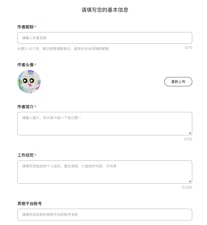 3、填写入驻信息:根据规范填入*昵称、*简介、*头像、*工作经历,其他平台账号等(标红为必填项);