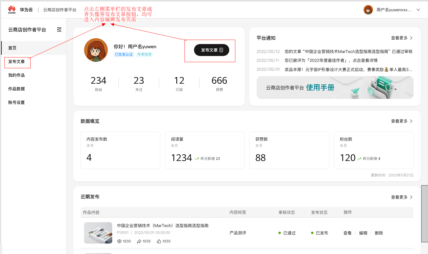 通过点击创作端首页左侧菜单栏的【发布文章】或个人头像旁的【发布文章】,进入内容编辑发布页面。
