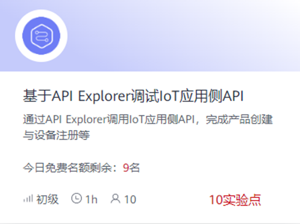 华为云API Explorer是一个API体验平台,提供API信息概览、SDK向导,以及API在线模拟调试。开发者可以在这里体验各种API使用场景。本实验将指导您基于API Explorer快速调调试华为云IoT平台的应用侧API,完成创建产品、注册设备等操作,掌握应用侧API的调用规范要求。