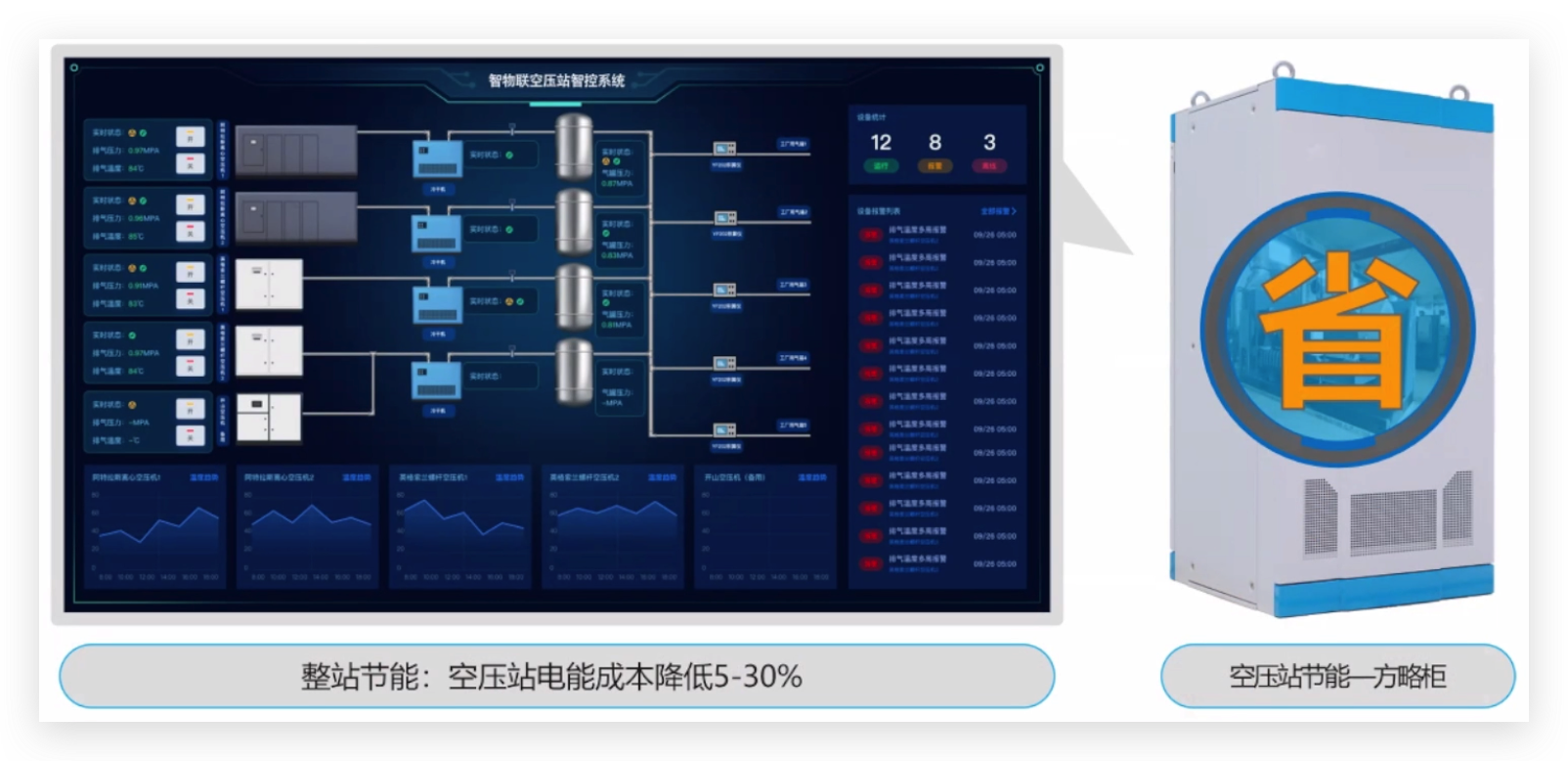 专利节能算法 + 边缘计算 + 智能联控,空压站智能联控,动态配载,平衡用气和供气需求,节省电能。