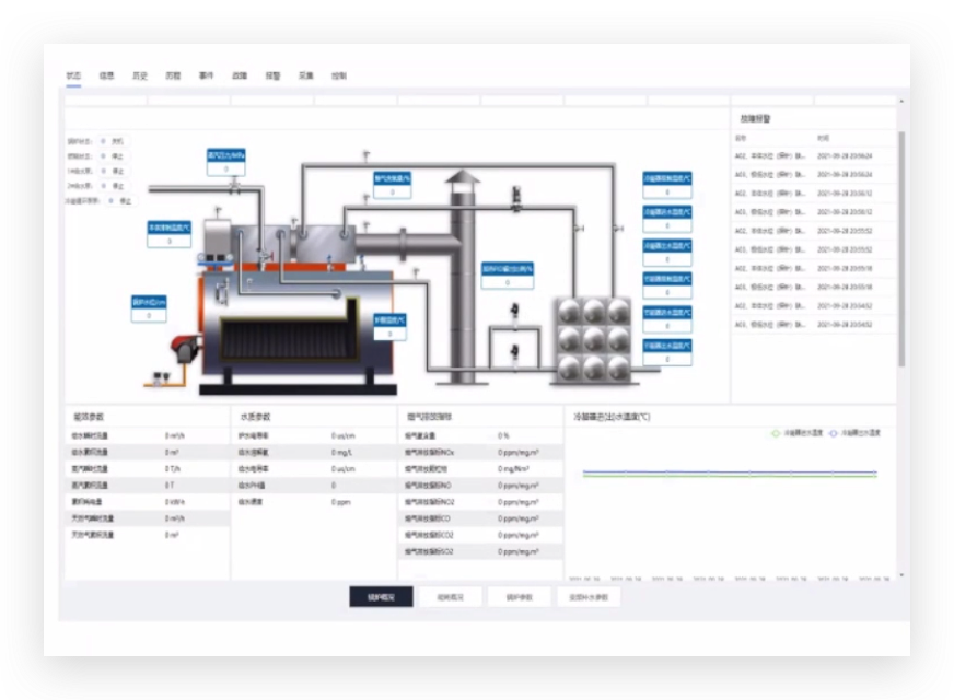 - 数据分析:实施采集、存储锅炉运行数据,通过既定的数学模型,将运行参数计算分析得出锅炉的能耗、燃烧效率,并输出设备的数据分析报表。