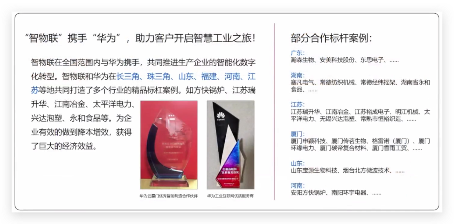 深圳智物联⽹络有限公司是一家提供⼯业互联⽹平台与解决⽅案的国家⾼新技术企业。第⼀批⼊选了⼴东省⼯业互联⽹⽣态供给资源池企业,也是⼴东省“上云上平台”试点示范供应商、深圳市专精特新中⼩企业,连续多年荣获⼯业互联⽹产业联盟颁发的⼯业互联⽹⽹络优秀解决⽅案和应⽤案例等荣誉。