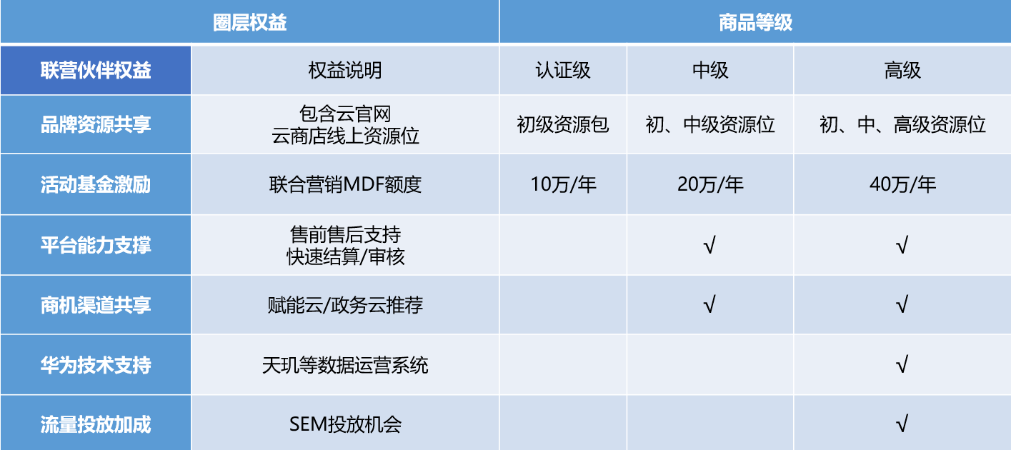 “圈层发展计划”是云商店联营伙伴专项合作计划,伙伴加入即可依托华为云品牌及市场资源不断积累商业价值,持续获得更高阶的资源及权益(华为云品牌资源/联合营销市场发展基金/优质平台服务/广告投放等)。