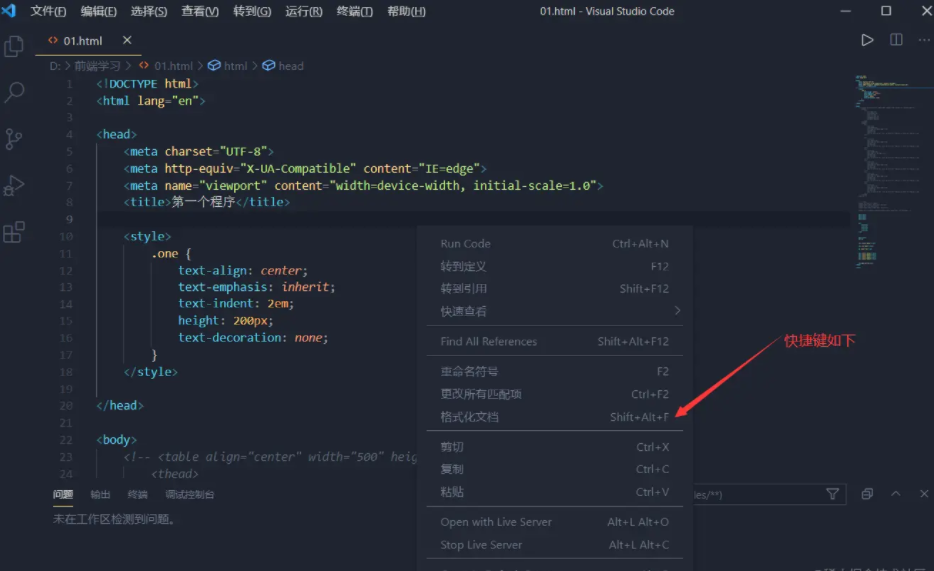 在vscode中可以随便书写网页内容,最后可以右键格式化文档来使整个网页内容变得整齐且符合书写规范