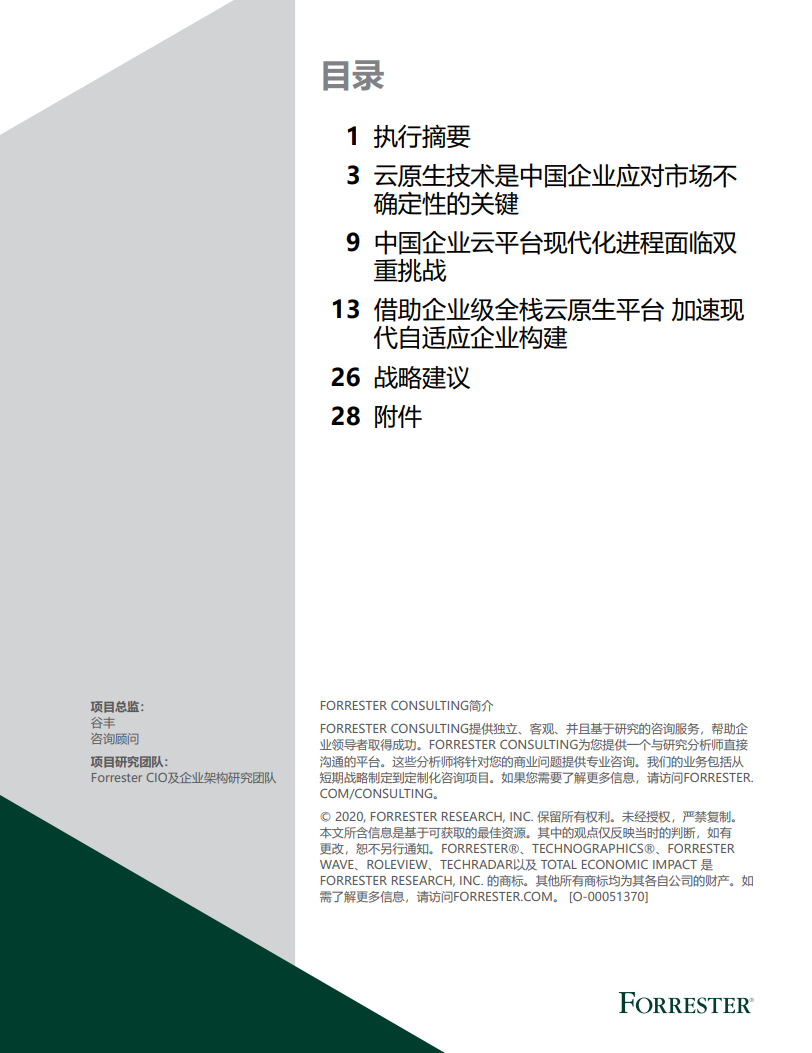 【摘要】 华为云社区 云享·书库No.34 期 推荐作者:华为云委托Forrester Consulting撰写发布时间:2020年11月..云原生技术是中国企业应对市场不确定性的关键中国企业云平台现代化进程面临双重挑战借助企业级全栈云原生平台,加速现代自适应企业构建.点击下载《拥抱云原生优先战略 构筑以“应用”为中心的 企业现代化IT基础设施》 了解详情. 精彩导读本研究通过聚焦云计算基础设施及云...