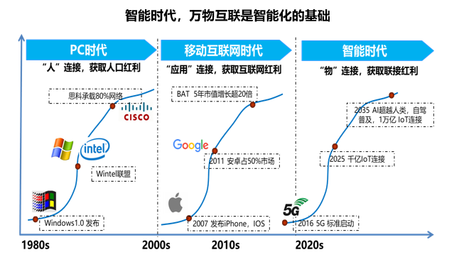 接下来呢,我们来简单看一下物联网发展的趋势。对于00后的朋友们,大家可能对上世纪89十年代的一个PC到互联网时代的发展没什么感知。但是小编个人呢,作为一个90后,我对整个互联网的兴起以及移动互联网的普及感触还是非常深刻的。在PC时代呢,主要是依赖于用户的拓展,通过把人连接起来,获取人口的红利。