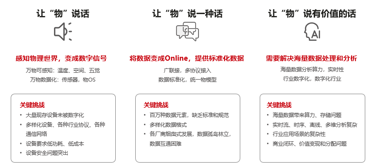 - 首先是让“物”说话。我们要从物的身上挖掘出有价值的信息,第一步就要先让他开口说话。我们可以举个例子,比如在物联网还没有开始大规模应用的时候,甚至现在很多欠发达的地区,我们家里的水表电表,每个月都是有专门的人上门来抄表的。工作人员挨家挨户地记录水表电表的变化情况,汇总到系统里,计算出来我们的水费电费,再通知我们去营业厅缴费。那在这个时候,水表电表,就是还不会说话的“物”。到了现在,我们的智慧城市发展起来,很多城市已经部署了智能的水电表,他们主动地会在指定的时间向云端上报读数和设备的运行状态。这不仅可以减少了人工统计的投入,还方便的我们对设备异常的检测,可以实时地查看设备是否有正常工作。但是实际上呢,我们现在存在的大量设备,都还没有被智能化和数字化,要想推动物联网的发展,就必须要让设备会说话,这也是物联网发展过程中的基本要求。
