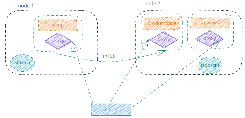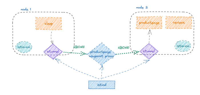 • 在sleep容器内访问productpage服务,首先请求被拦截到同节点的ztunnel中,ztunnel做基本的四层负载均衡和TLS加解密,最后选择一个目标实例(productpage容器的IP)将本次请求转发出去。