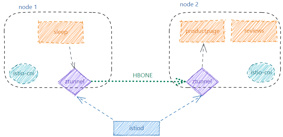 我们知道ztunnel只能进行四层的流量治理,四层负载均衡以及TLS流量加密、基本的认证和鉴权等,而不能进行更高级的七层路由和认证鉴权。这里我们通过sleep应用访问bookinfo的例子,深入理解Ambient Mesh的四层流量是如何路由的。本例子的实际环境背景如下,sleep和productpage应用分别运行在两个不同的节点。