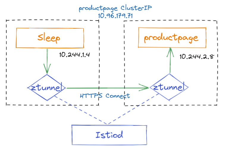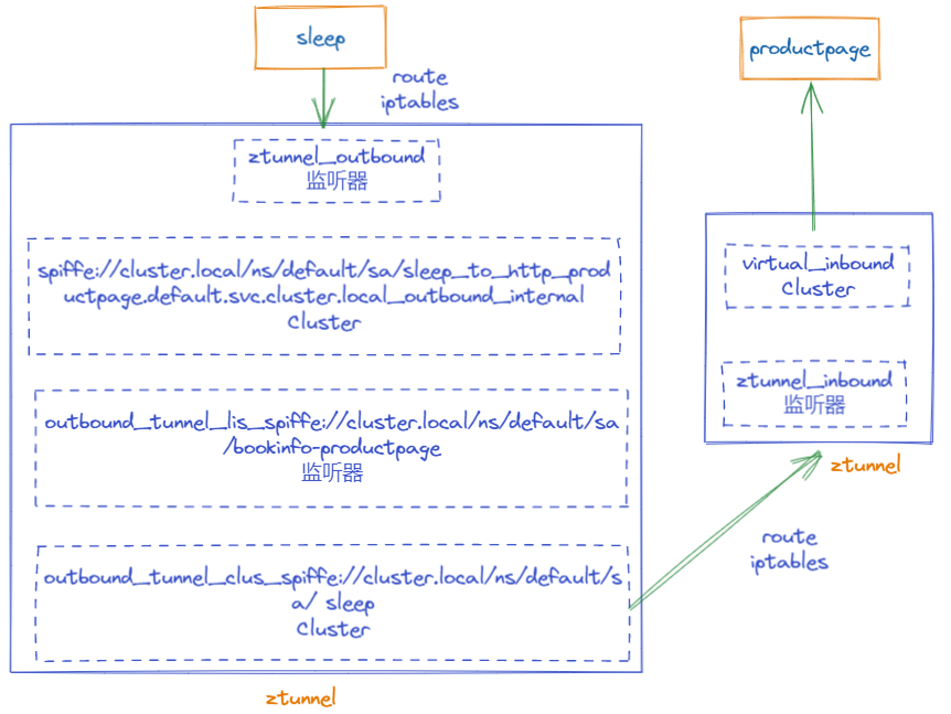 (1) sleep访问productpage的流量被同节点的tunnel以TPROXY(透明代理)方式拦截转发到ztunnel(监听127.0.0.1:15001),使用TPROXY的好处是保留原始的目的地址,ztunnel做转发时必须依赖原始目的地址。