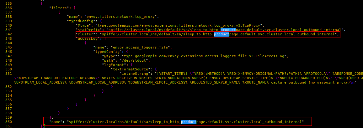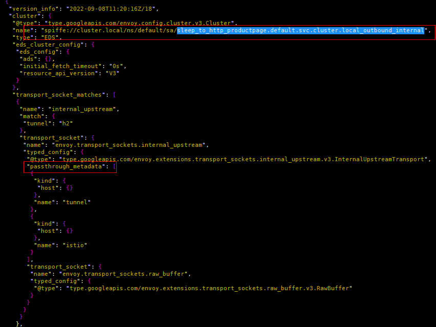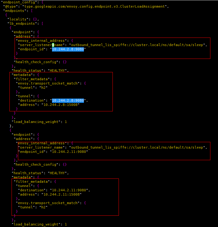 (3) "spiffe://cluster.local/ns/default/sa/sleep_to_http_productpage.default.svc.cluster.local_outbound_internal"过滤器关联到同名的Cluster。该Cluster一共包含两个Endpoint实例,根据负载均衡算法选择某一个Endpoint,并且最重要的是将metadata(tunnel的destination和address)传递给名为"outbound_tunnel_lis_spiffe://cluster.local/ns/default/sa/bookinfo-productpage" 的监听器处理。