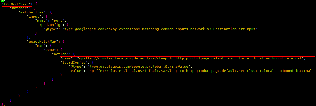 可以看到所有的过滤器链都没有设置匹配条件(默认全部匹配),那么这时ztunnel怎么根据流量特征选择目标过滤器链的呢?原来在监听器根上还有一种设置过滤器匹配条件的方式,通过下面匹配到源地址为10.244.1.4,目的地址为10.96.179.71,目的端口为9080的流量,交由"spiffe://cluster.local/ns/default/sa/sleep_to_http_productpage.default.svc.cluster.local_outbound_internal"过滤器处理,