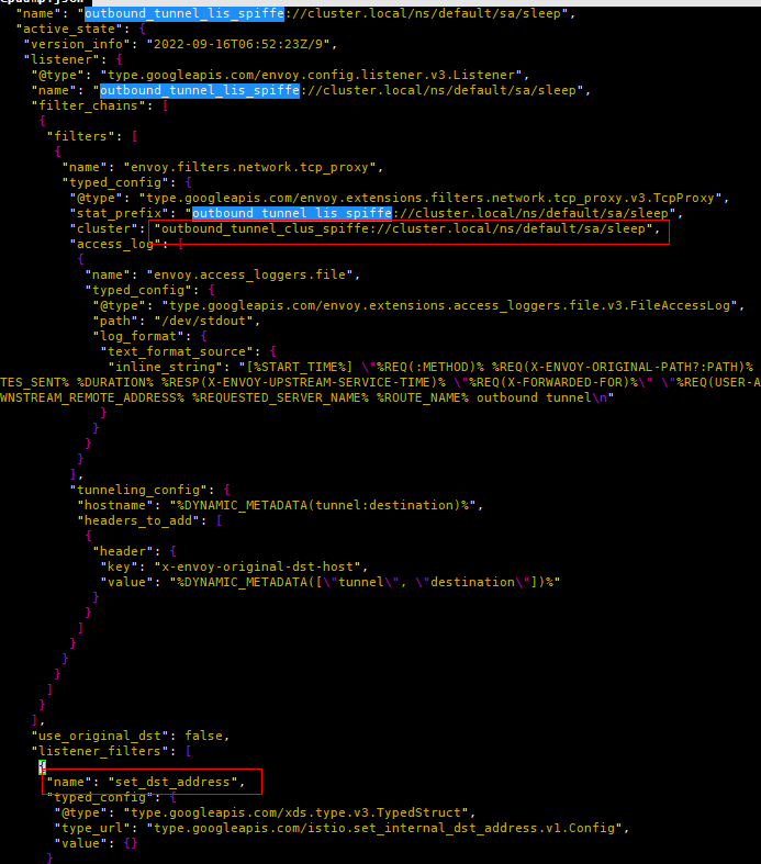 (4) “outbound_tunnel_lis_spiffe://cluster.local/ns/default/sa/sleep”监听器通过“set_dst_address”过滤器根据上一步的选择的Endpoint的metadata设置数据的目的地址。假如前面outbound_internal Cluster选择的是10.244.2.8:9080这个Endpoint,那么这里的tunnel监听器将把10.244.2.8:15008设置为目的地址。另外该监听器,只有一个TcpProxy,关联到名为“outbound_tunnel_clus_spiffe://cluster.local/ns/default/sa/ sleep”的Cluster,那么流量自然交由该Cluster处理。TCP过滤器上还设置了HTTP Connect隧道(承载发送到10.244.2.8:9080的流量),供后面productpage所在节点的ztunnel使用。HTTP隧道是Ambient Mesh 组件之间安全通信的承载协议。