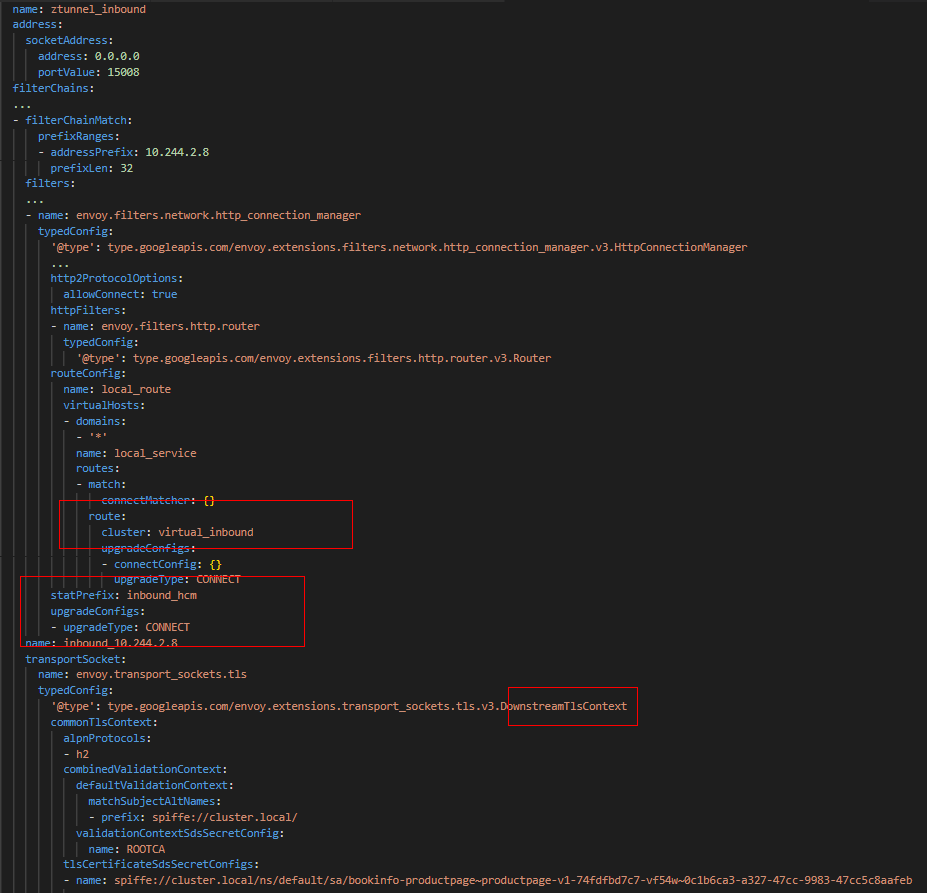 (2) ztunnel上面“ztunnel_inbound”监听器监听在15008端口,因此流量首先经过ztunnel_inbound监听器的处理。ztunnel_inbound监听器上面设置了TLS,根据其配置与下游进行TLS握手,从而所有的ztunnel之间基于双向TLS加密通信。另外,从下面配置中可以看到,CONNECT 升级已经设置,那么Envoy就会代理HTTP的Connect请求。除此之外,RouteMatch中设置了connectMatcher,意味着将HTTP Connect请求交由“virtual_inbound”Cluster处理。