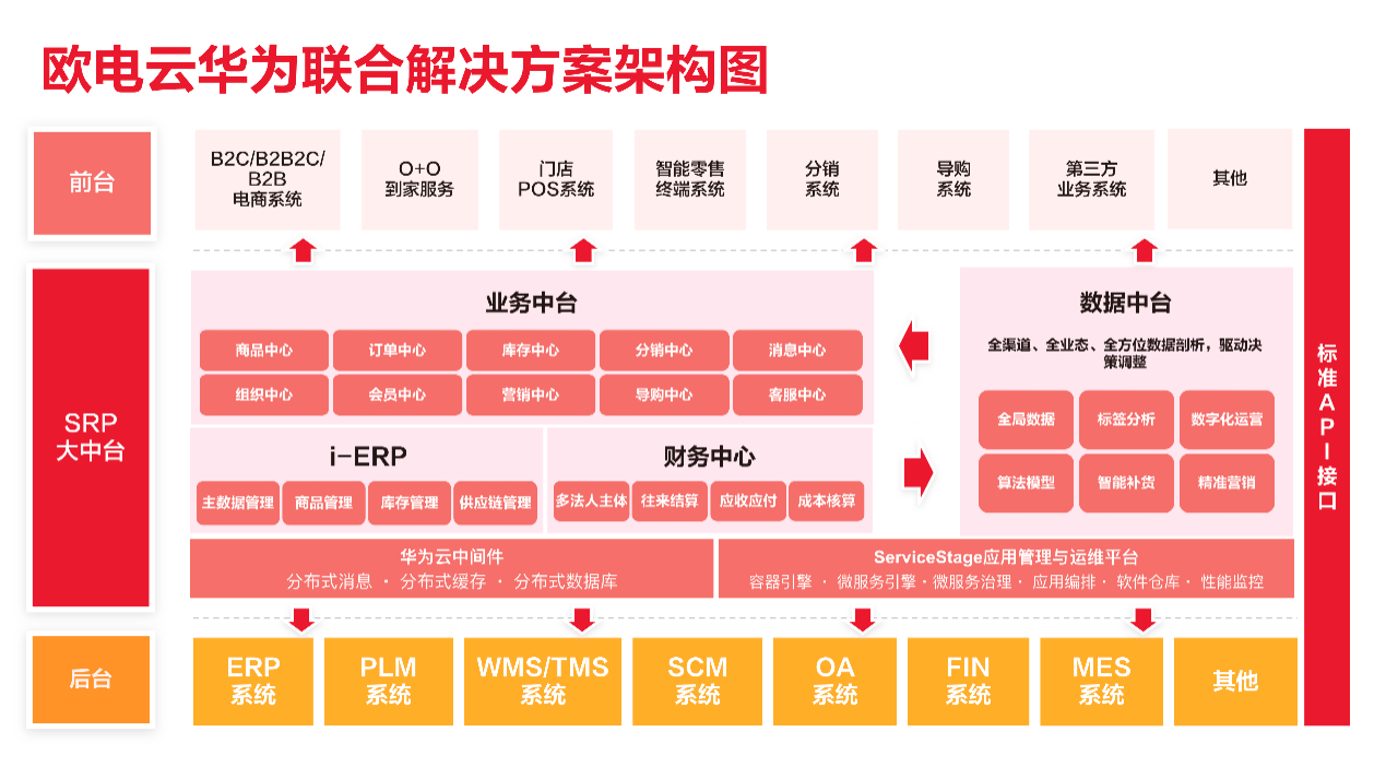 以欧电云SRP大中台系列软件为例,其将企业前端业务与后端管理全面整合,打通B2B、B2C、B2B2C、O+O等业务场景,让数据流通更及时、商业决策更畅通、成就更优商业价值,当前已上架华为云云商店,服务于各行各业的数字转型需求。