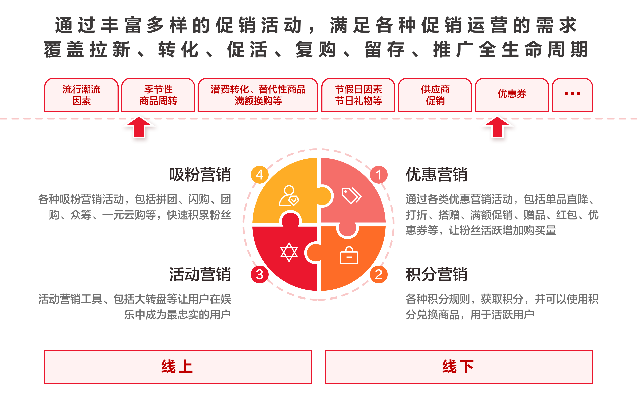 通过丰富多样的促销活动,满足各种促销运营的需要,覆盖拉新、转化、促活、复购、留存、推广全生命周期。