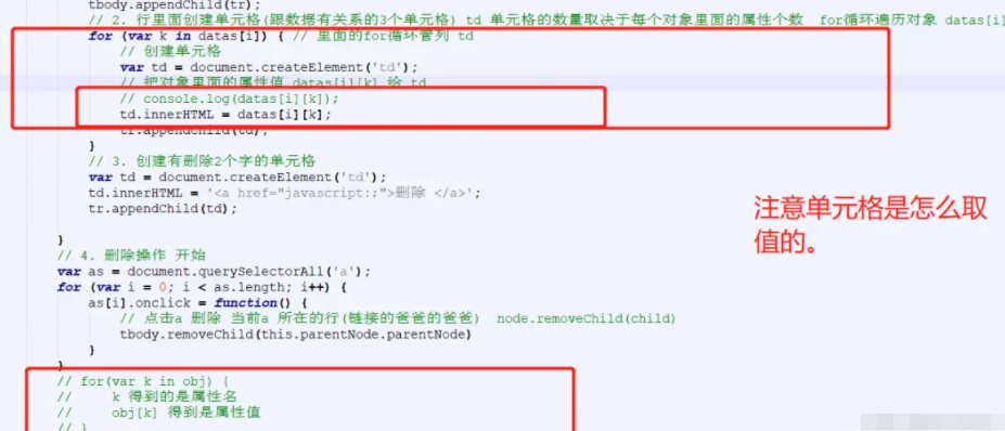 - 每个行里面又有很多单元格(对应里面的数据),我们还继续使用循环创建多个单元格,并且把数据存入里面(双重for循环)