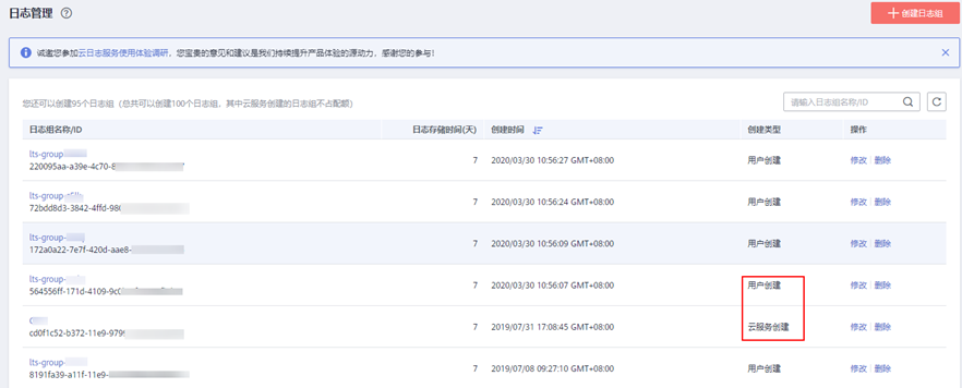 日志组的创建类型分为用户创建(主动)和云服务创建(被动)。