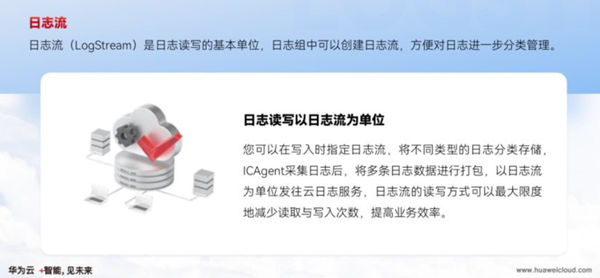 日志读写以日志流为单位,您可以在写入时指定日志流,将不同类型的日志分类存储,ICAgent采集日志后,将多条日志数据进行打包,以日志流为单位发往云日志服务,日志流的读写方式可以最大限度地减少读取与写入次数,提高业务效率。