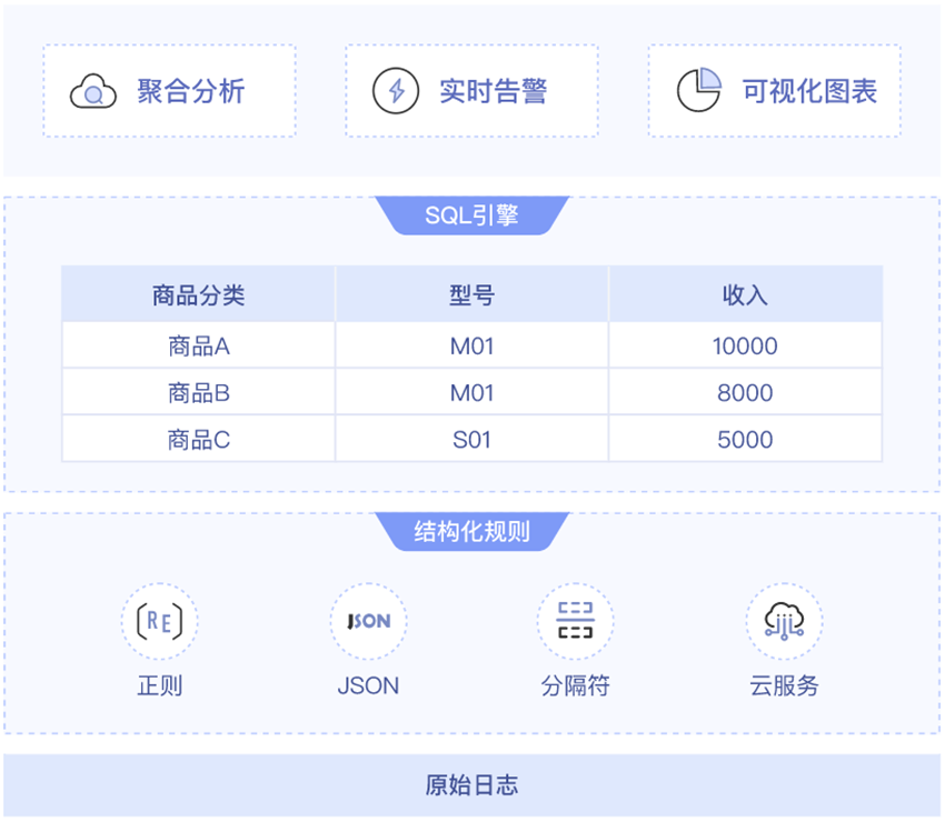 采集到日志数据按照结构化和非结构化进行分析。结构化日志是通过规则将日志流中的日志进行处理,提取出来有固定格式或者相似度高的日志内容做结构化的分类。这样就可以采用SQL的语法进行日志的查询。