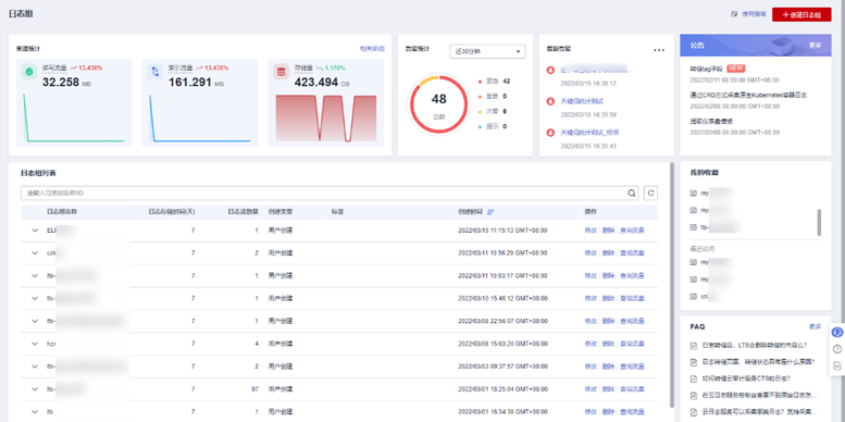 云日志服务控制台首页提供资源统计、我的收藏、最近访问、告警统计、最新告警、功能上线公告和FAQ等信息。