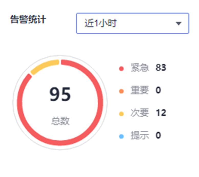 告警统计展示云服务日志的告警总数及各个告警级别的数量。告警统计时间有:近30分钟、近1小时、近6小时、近1天和近1周;告警级别包括紧急、重要、次要和提示。