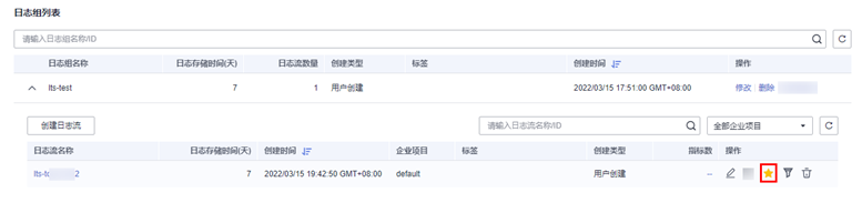 以日志组lts-test为例,收藏日志组lts-test下某个日志流的操作步骤如下: