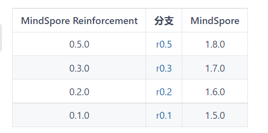 要实现MindSpore Reinforcement的强化学习训练,需要先安装MindSpore,然后再安装MindSpore Reinforcement。他们之间的版本依赖有以下的关系: