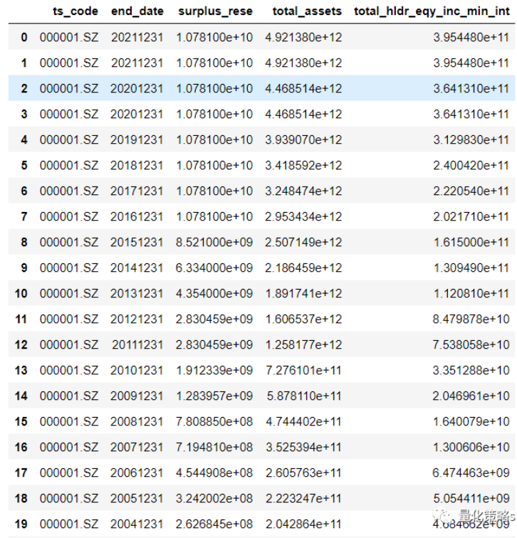 再次,依次从每个股票的年度资产负债表获取盈余公积金、资金总计和股东权益。实际操作中可以考虑用季度数据,但要小心有些行业在在季节性。