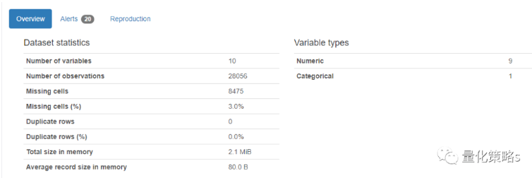 可以看到数据集没有重复行,但有3%的空缺值,并且还有20条警告。