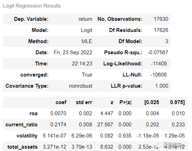 logit = sm.Logit(all_data3['return'].astype(bool), all_data3[['roa', 'current_ratio', 'total_assets']])