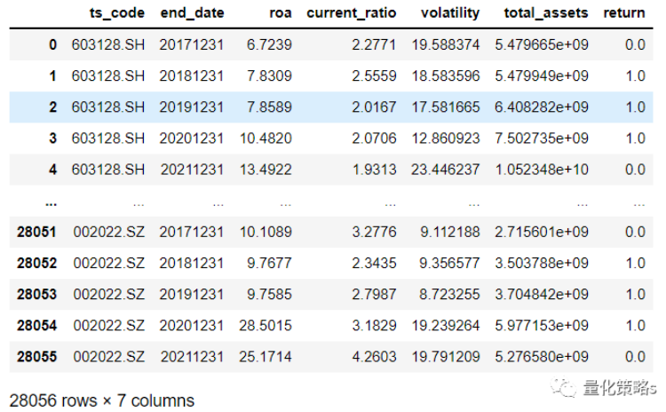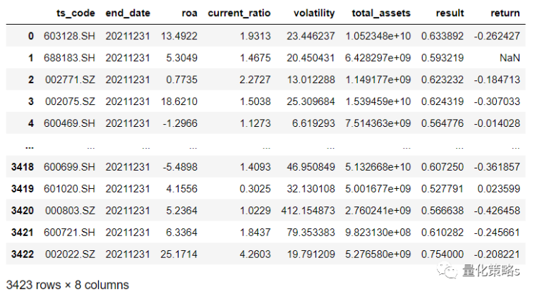 第七,确定因变量,在一些研究中,往往把是否ST作为因变量,即使在一些股票投资的研究中。这明显是一个不合理的设计,我们这里改成年下跌幅度20%的为坏样本,当然,这也大概率不是一个合理的指标。我们用2021年之前的数据作为训练样本,2021年底以来的半年作为检测。