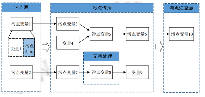 2)污点传播分析:利用特定的规则跟踪分析污点信息在程序中的传播过程