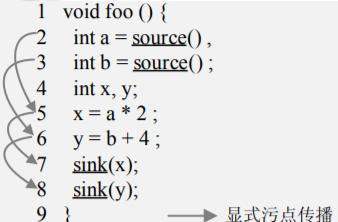 污点传播分析中的显式流分析就是分析污点标记如何随程序中变量之间的数据依赖关系传播.