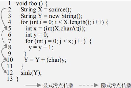 污点传播分析就是分析污点标记数据在程序中的传播途径.按照分析过程中关注的程序依赖关系的不同, 可以将污点传播分析分为显式流分析和隐式流分析.