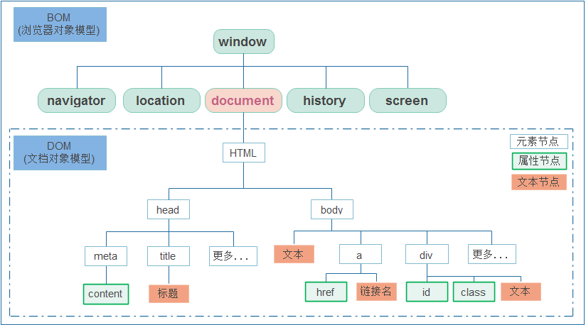在浏览器页面文档中,每个元素( 包括整个文档,文档头部, 文档中的表格,表头,表格中的文本)都是文档对象模型(DOM)的一部分,因此它们可以使用 DOM 和一个脚本语言如 JavaScript,来访问和处理。