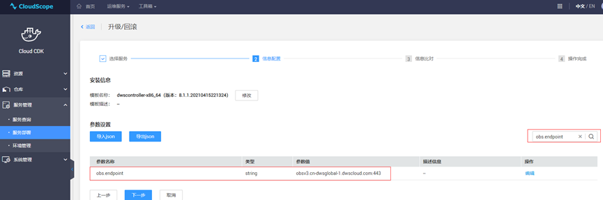 3.1.1 使用op_cdk_sso登录cloudscope查看dwscontroller服务下obs服务的配置信息及后台数据库登录信息