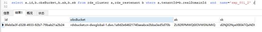 select a.id,b.obsBucket,b.ak,b.sk from rds_cluster a,rds_restenant b where a.tenantId=b.realDomainId and name={集群名称}