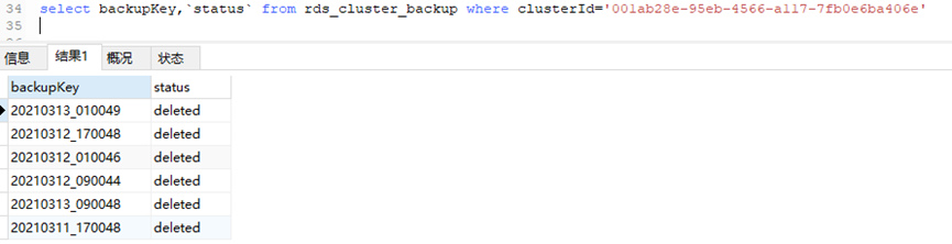select backupKey,`status` from rds_cluster_backup where clusterId={集群id};