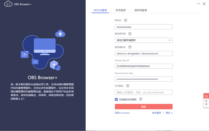 根据3.1收集的信息填充服务器地址,Access Key ID(即AK),Secret Access Key(即SK)