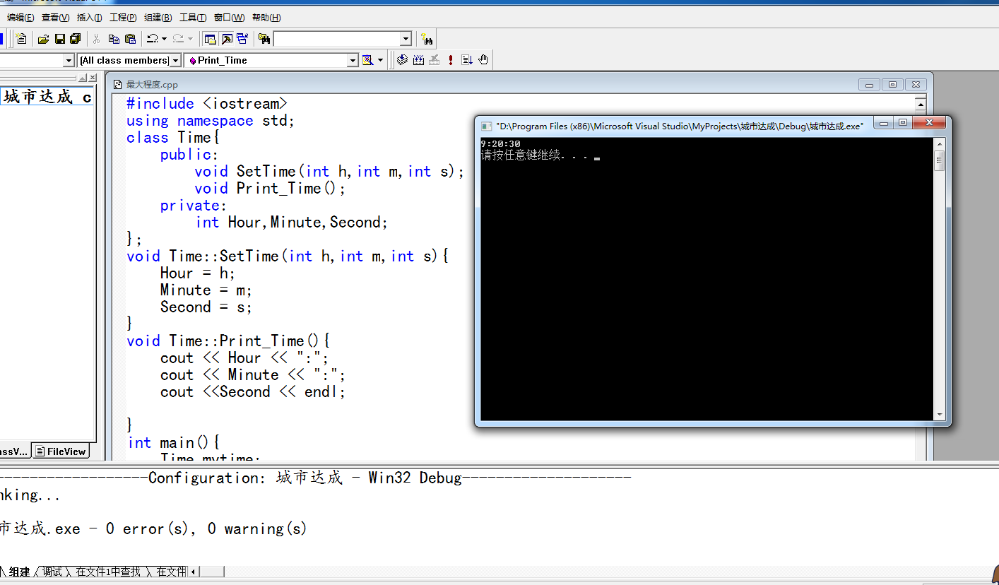 在这个类中我们创建了两个函数 void SetTime(int h,int m,int s)用来创建对时间变量进行初始化和 void Print_Time();这个函数的作用是对创建的时间对象输出它的Hour,Minute,second这三个数据成员对应的值