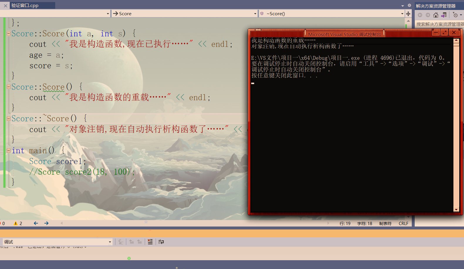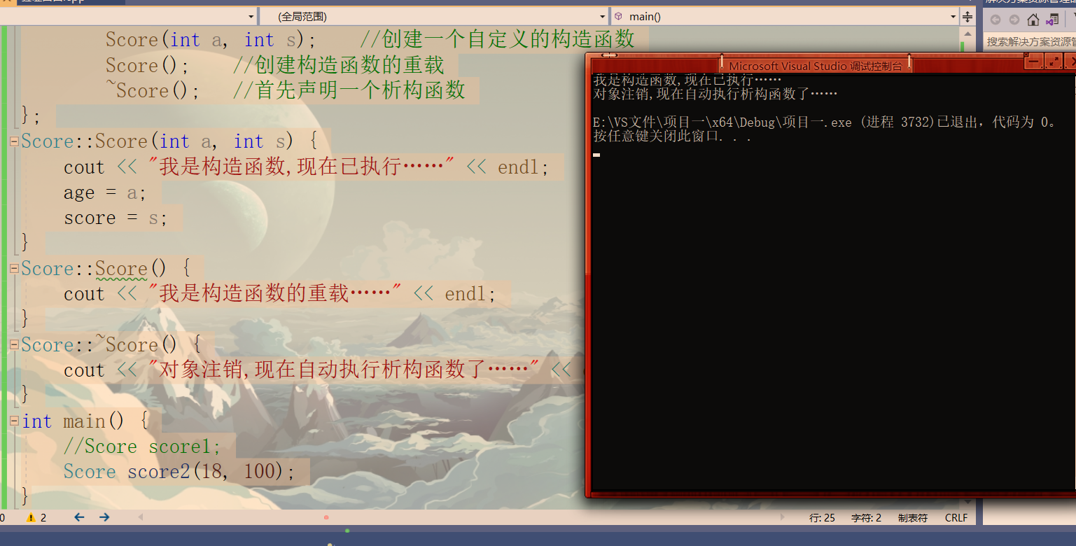 在上面我们定义了两个构造函数,所以我们定义的对象会根据对象传递的参数来自行选择构造函数,但是析构函数是总会在对象注销的时候执行,并且由于析构函数是没有参数,也没有返回值,所以构造函数是不能够重载的,因此在一个类中只能够有一个析构函数,并且如果我们不自定义析构函数的话,程序就会自动调用默认的析构函数