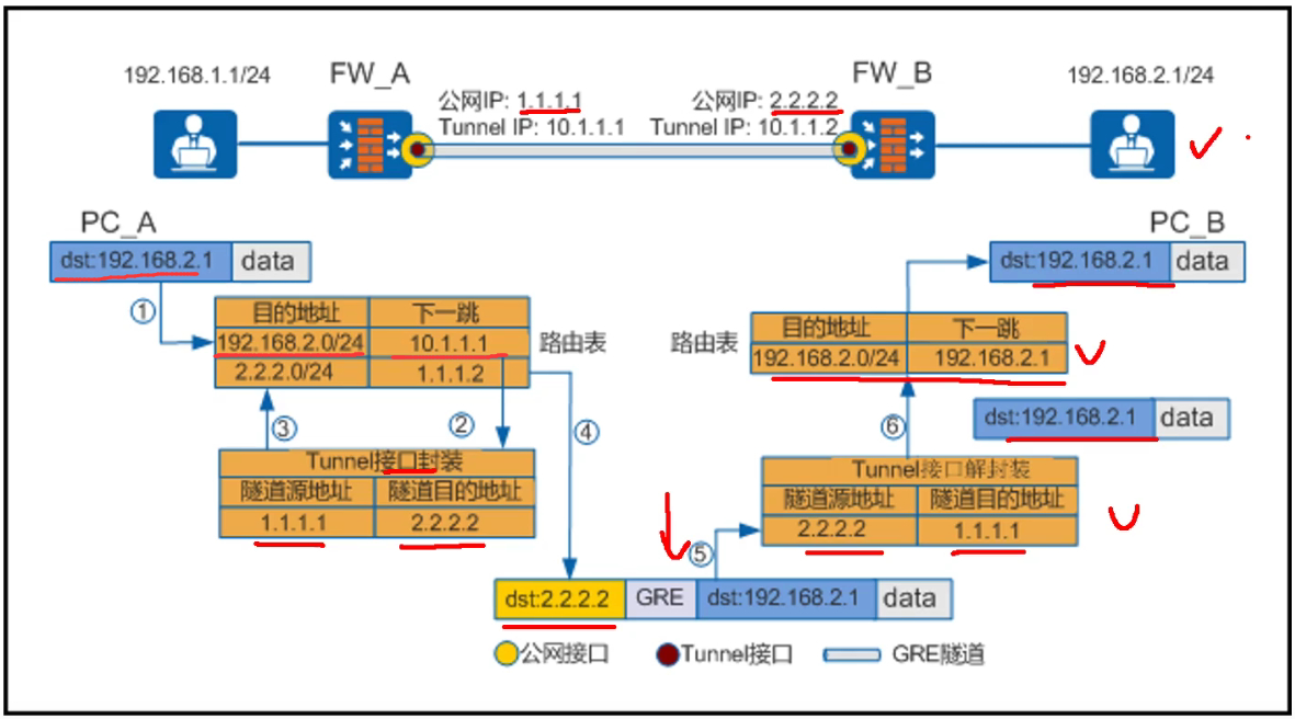 • 目标设备收到数据报文后,进行解封装,看到GRE报文后,会继续解封装,然后在看到原先发送的数据报文,发现是私网包头,进行查找路由,发现有就进行转发,回包也是如此,这就完成通讯。