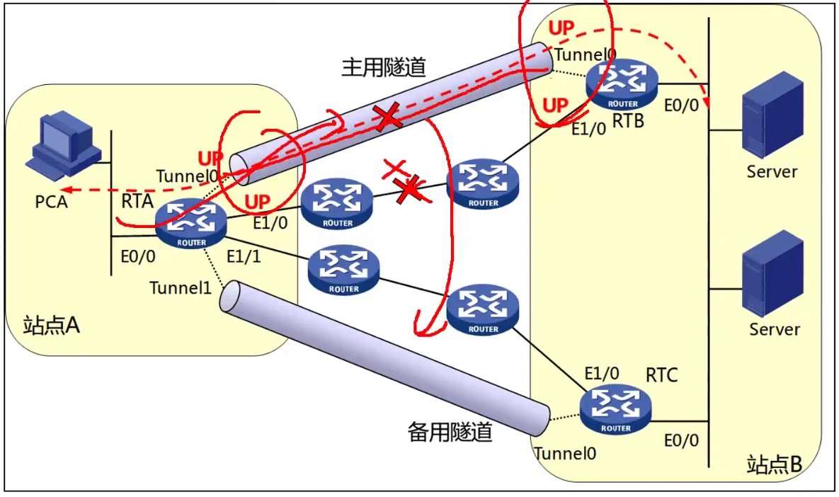• 隧道口激活UP状态很简单,只要有去隧道目标的路由,即可启用隧道口,他不判断隧道目标链路是否正常,没有检测机制,如果中间链路出现故障,那么会造成业务中断。