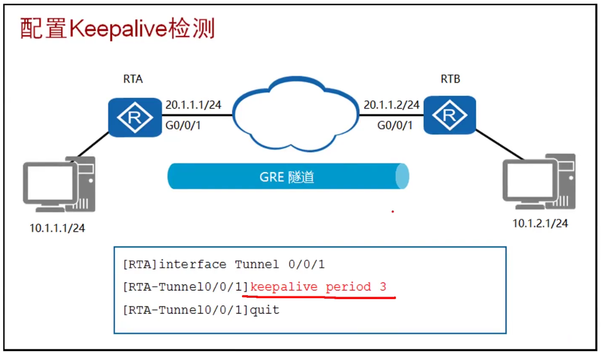 • 解决办法:开启keepalive,开启后,会通过隧道发送keepalive的数据包让对端回复,周期性发送,用于检测对端隧道是否可达。会发送keepalive message ,对端隧道会进行keepalive reply 回复。