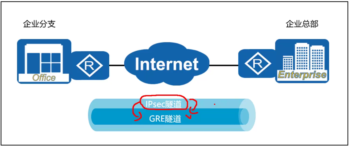• GRE简称通用路由封装协议(Generic Rrouting Encapsulation)他的作用是把一种协议的报文封装在另外一种协议的报文中的技术,是一种隧道技术(只要这样子做,都称为隧道技术)。所以我们抓包看到的至少有两个头部,这两个头部的作用就是穿越异种网络。而且他还可以对组播报文进行封装,这是IPsec做不到的,也就是说我们可以在GRE上面跑路由协议(可以让两个异地的设备跑动态路由),并且可以和IPsec结合,保证更高的安全性。