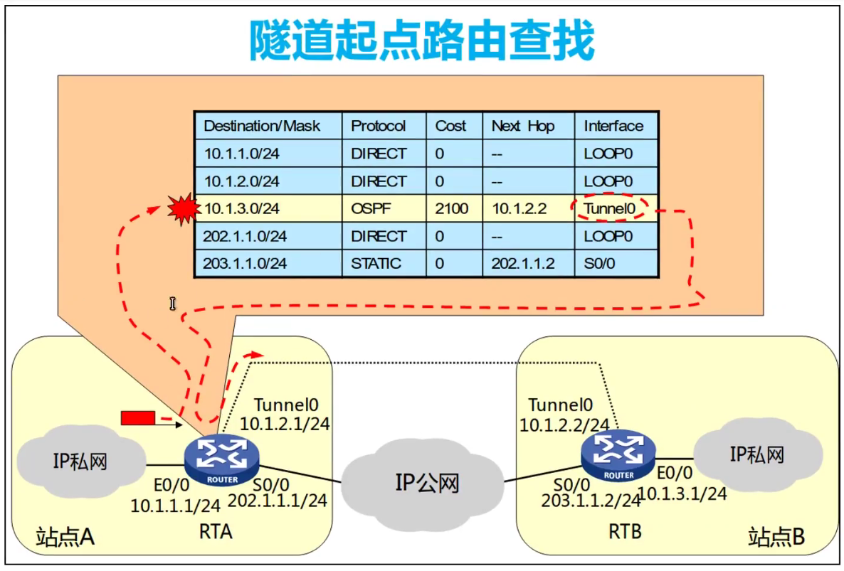• 隧道口的意义在于设备查找路由时找到出接口是隧道口,或者下一跳是隧道目标。