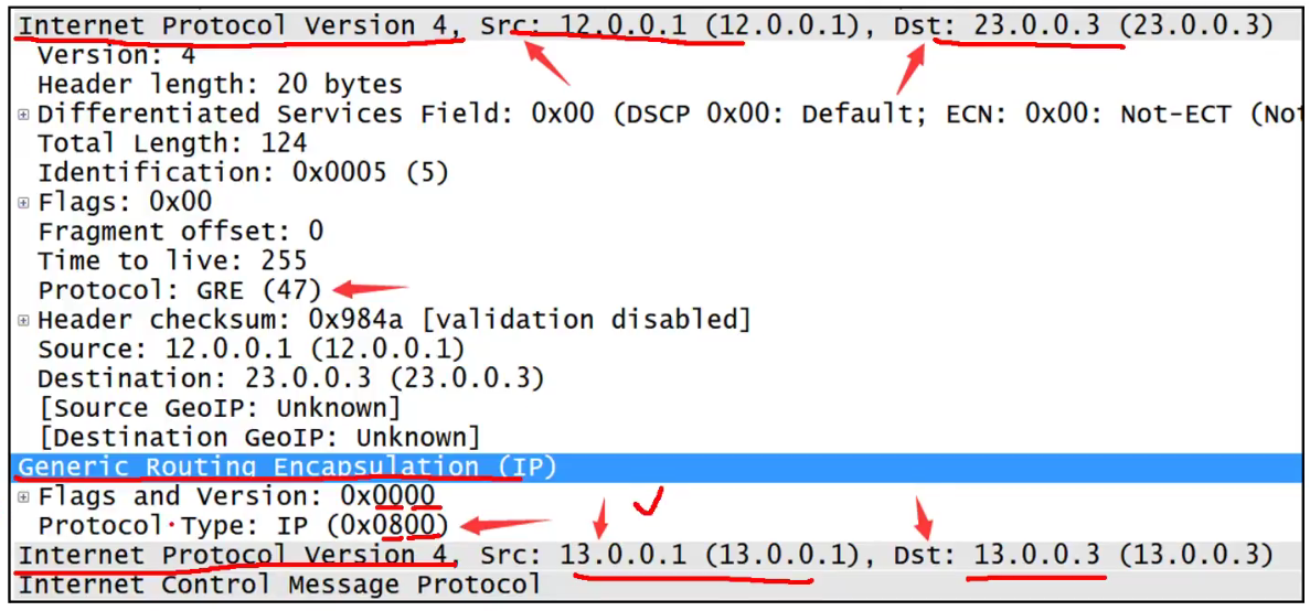 • 协议号为47,经过GRE封装后,新的IP报头的协议号为47。GRE报头里面还有载荷协议,用于判断上层是上面类型。