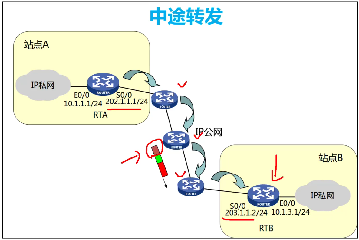 • 数据报文发送出去后,中途运营商的设备会根据外层的IP报头进行转发。