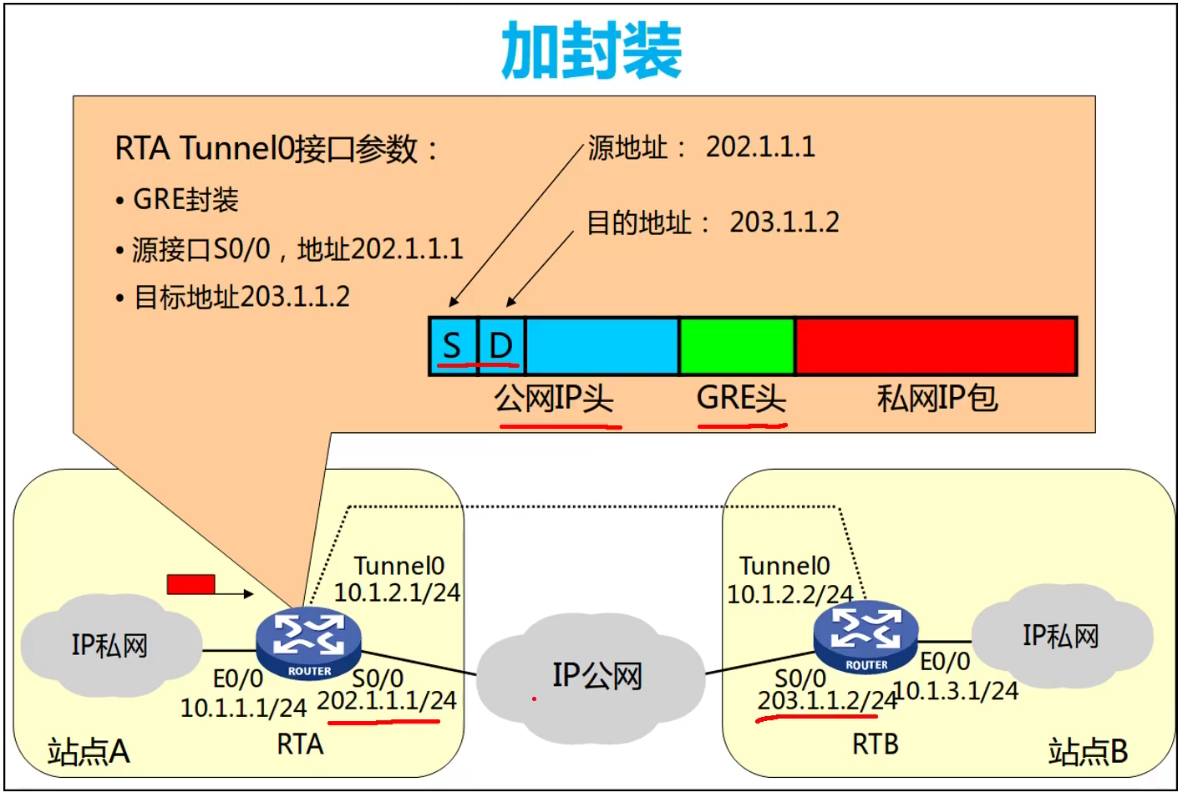 • 设备加了一个GRE头部,同时会有新的IP头部,这个新的IP头部,会有新的源和目标IP地址,就是建立时的隧道源和隧道目标。
